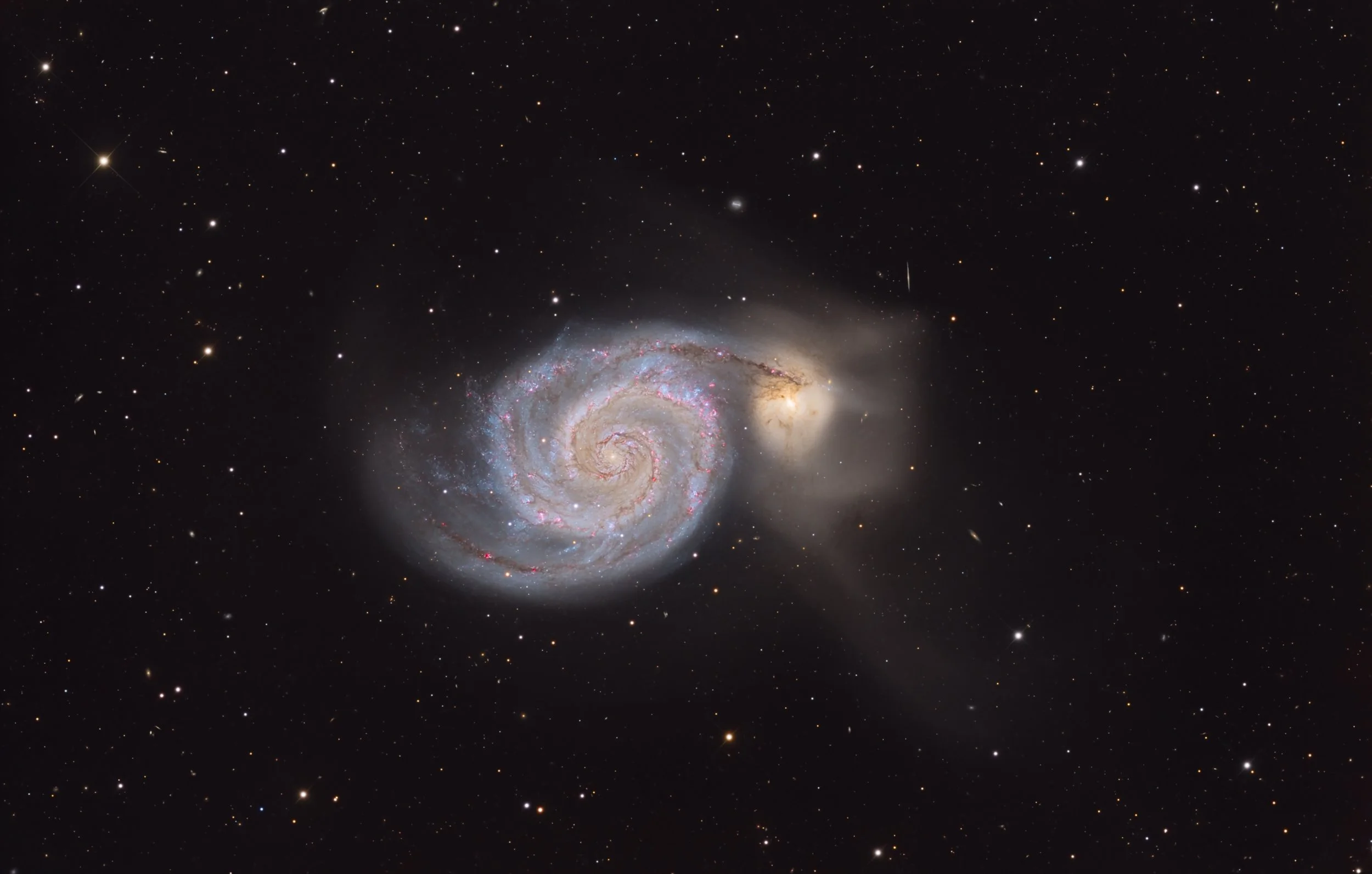 Located approximately 31 million light-years away in the constellation Canes Venatici, Messier 51 is one of the most iconic "grand-design" spiral galaxies in the night sky. Also known as the Whirlpool Galaxy, it is famous for its well-defined spiral arms and its dramatic gravitational interaction with the smaller companion galaxy, NGC 5195, which is slowly drifting behind it.
